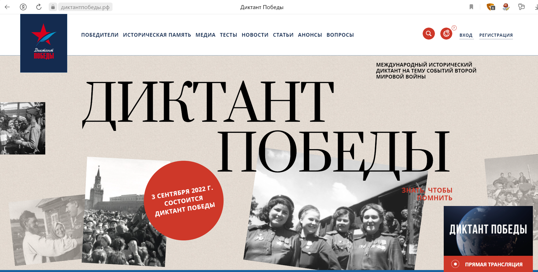 3 сентября 2022 года состоится Диктант Победы 2022 — одно из тех мероприятий, которое позволит прикоснуться к исторической памяти, попробовать свои силы и узнать новое о прошедшей войне и её героях. Для того чтобы принять участие в акции, необходимо зарегистрироваться на сайте https://диктантпобеды.рф/ Инструкция по регистрации на портале Диктант Победы https://vk.com/mku_yo?z=video-187069989_456239187%2F54b280732a767a7964%2Fpl_wall_-187069989. Принять участие в акции можно в день проведения диктанта на региональной площадке, а также в формате онлайн на сайте диктантпобеды.рф. Диктант Победы можно написать онлайн на сайте диктантпобеды.рф. Возможность пройти тест появится на сайте 3 сентября в 09.00 по московскому времени. Тест будет доступен длительное время, как на английском, так и на русском языках.